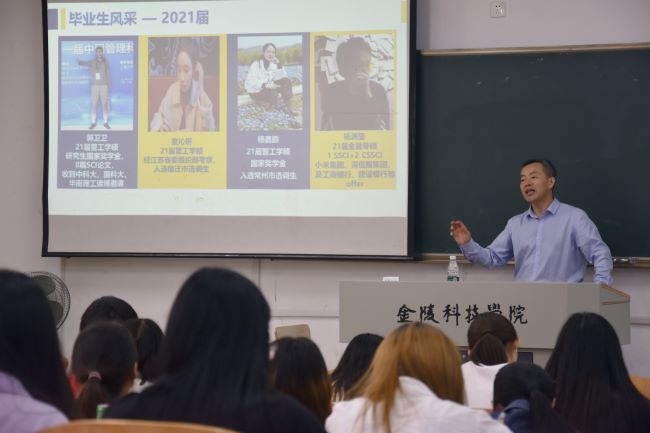 近两年的考研成果,鼓励同学们为梦想加油,确立学业目标,用奋斗的青春成就无悔人生。接着她隆重介绍了刘军教授,并邀请刘教授作报告。随后,刘军教授从师资力量、专业方向、就业状况、考研科目调整、招生人数等方面,为同学们进行了详细解读。他结合自身成长经历,鼓励同学们树立远大理想,增强考研自信,通过不懈努力,实现奋斗目标。他希望同学们深入了解并报考南京信息工程大学,期待与同学们共同谱写人生新篇章。最后,刘教授还与同学们进行了亲切交流,就同学们关心的问题进行了认真解答。