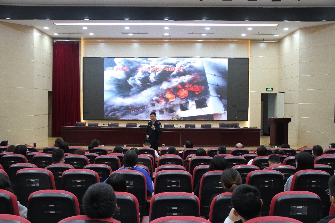 在科技楼报告厅,进行主题为“增强全民防火意识,提高全民消防素质”的消防安全专场宣讲。