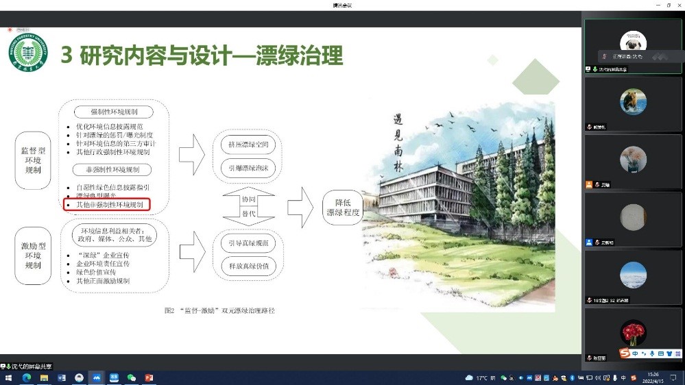 沈弋教授以其主持的国家社科基金项目(我国企业漂绿行为测度与治理研究)的申报思路和阶段性成果为例,梳理了企业漂绿行为的研究动态,指出了该领域的研究空间,简要介绍了他获取“漂绿”词集所采用的基于Text Rank算法、斯坦福大学glove、余弦相似度算法的文本分析技术,以及企业漂绿指数的计算方法,创新性提出了基于监督型、激励型环境规制的“双元漂绿治理路径”,以挤压漂绿、引导真绿,降低企业漂绿行为。沈弋教授还介绍了他的working paper《众喣飘山:基于文本情绪的中小股东监督与漂绿治理》。在交流环节,他针对青年教师提出的如何更好测度企业漂绿指数,以及成人抖音