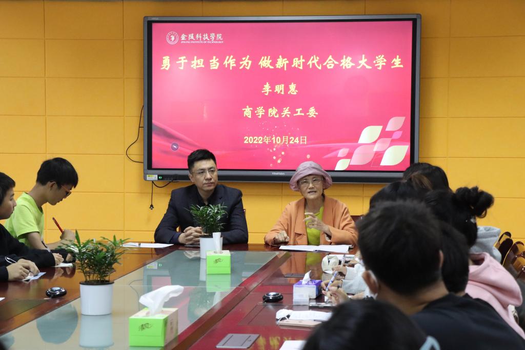 李明惠老师以《勇于担当作为,做新时代合格大学生》为题发表了讲话,结合中国共产党第二十次全国代表大会相关内容,分别从正确认识国家、提高个人素质和勇于担当三个方面与青年学生展开深入交流。会议伊始,李明惠老师就借用习近平总书记在二十大开幕会上对青年学生提到的要求说道:“同学们要坚定不移听党话、跟党走,怀抱梦想又脚踏实地,敢想敢为又善作善成,立志做有理想、敢担当、能吃苦、肯奋斗的新时代好青年”。其次,她也指出新一代青年应提高个人的综合素质与专业能力,注重实践,勤于学、善于思、精于研,努力成为专业领域里全面发展的综合型人才,在创新创业中取得非凡成绩。最后,李明惠老师对在场的学生骨干和学生党员作出了期待,希望各位能庆幸生逢伟大盛世,深感肩负光荣使命,积极发挥带头作用,争做担当民族复兴重任的时代新人。