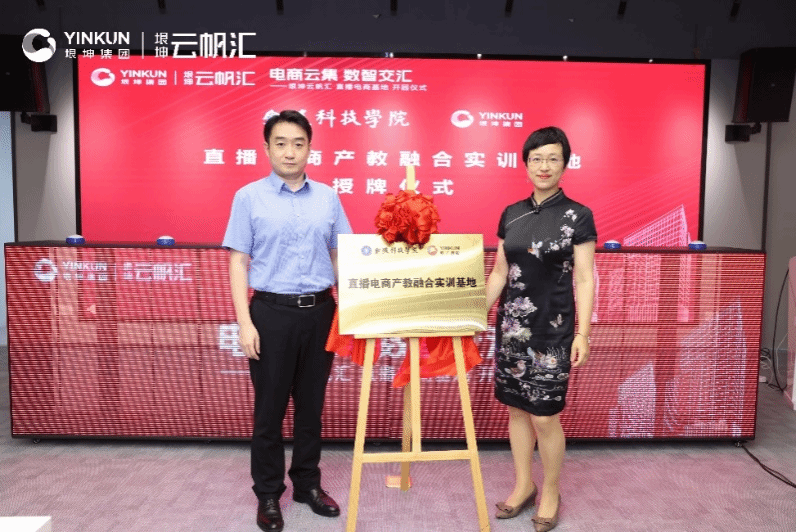 党委副书记孙亮和垠坤集团执行董事沈萌萌共同为金陵科技学院&垠坤集团“直播电商产教融合实训基地”进行了揭牌。
