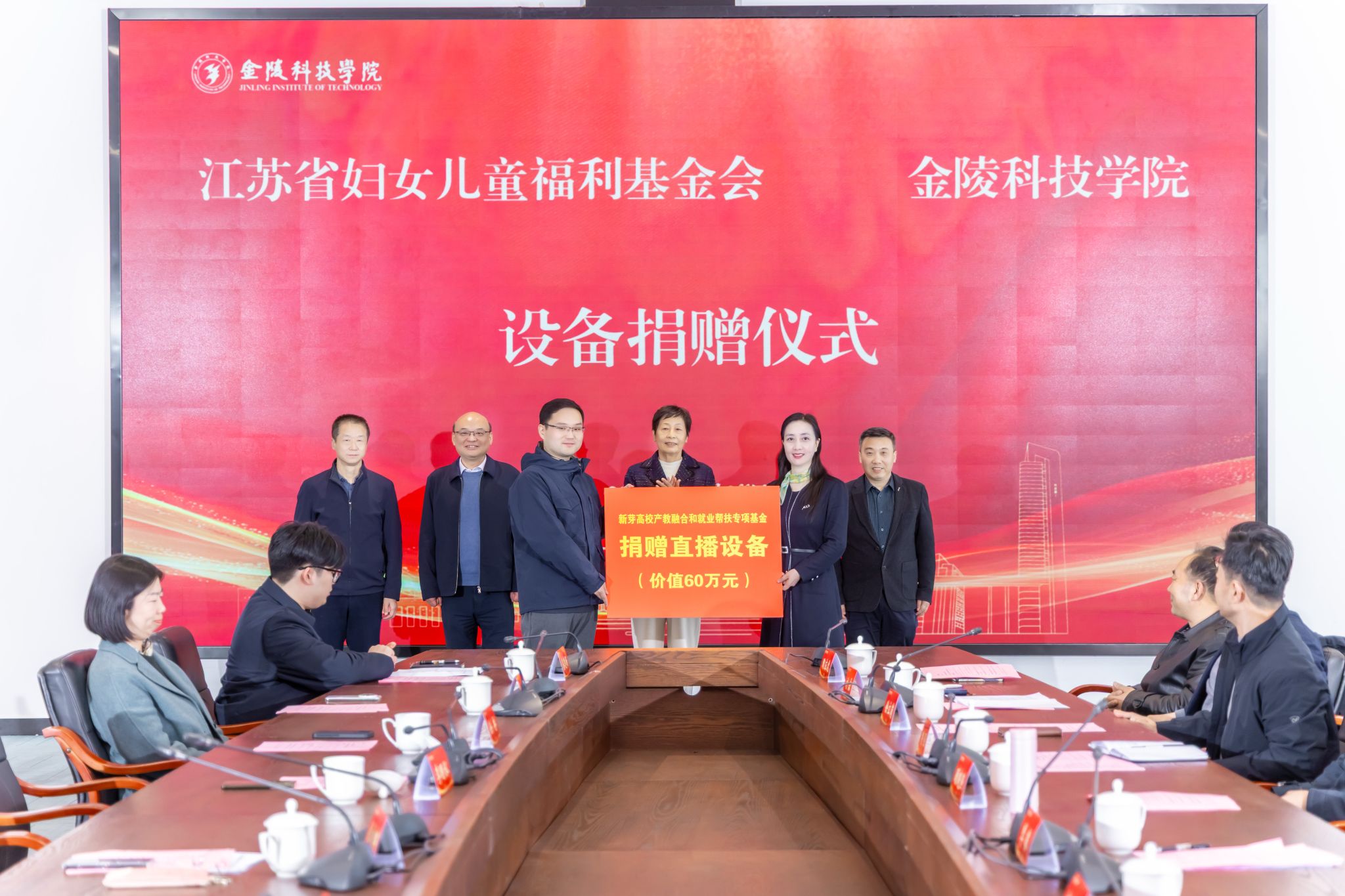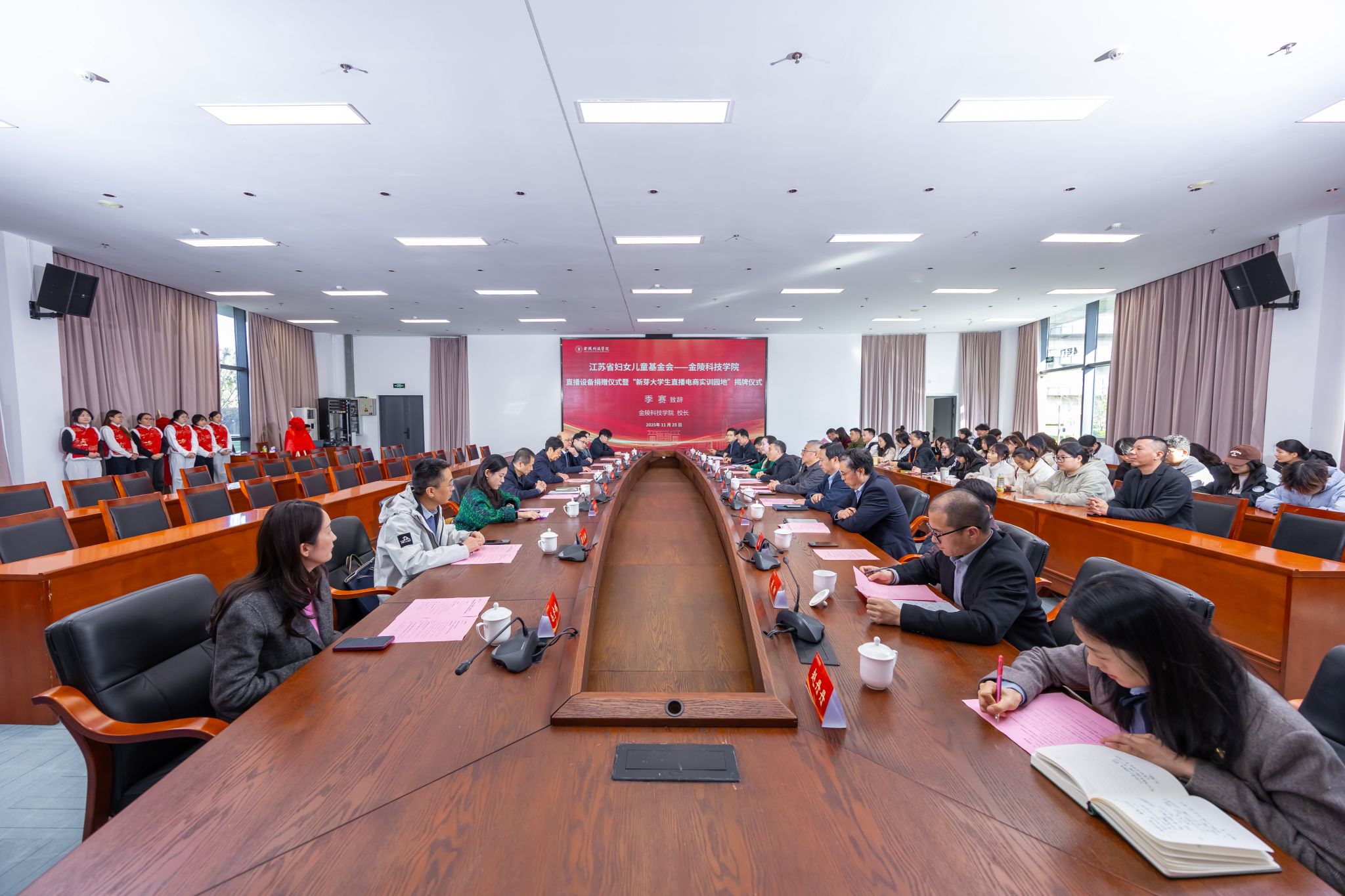 与江苏省妇女儿童福利基金会在3号科技楼110会议室举行直播设备捐赠暨“新芽大学生直播电商实训园地”揭牌仪式。江苏省妇女儿童福利基金会副理事长宋晓辉,南京市农业农村局副局长李明水,南京市人社局一级调研员吴传军,成人抖音