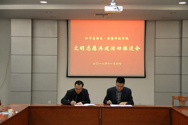 推进会上,江宁高新区调研员许刚就文明志愿者活动的基本情况进行了介绍,并宣读《江宁高新区与金陵科技学院文明志愿共建协议书》,随后双方代表在协议书上签字。江宁高新区政协工委主任、党工委副书记沈哲在讲话中指出,江宁高新区与金陵科技学院文明志愿共建活动旨在充分发挥在校大学生的力量,宣传创建活动,以点带面,逐步改善江宁高新区人居环境,弘扬社会公德,引导全社会共同参与到城市治理工作中。金陵科技学院党委副书记单晓峰围绕“社会体验”、“志愿者”、“城市治理”三个关键词阐释了本次活动主题“文明志愿我先行,共建文明新园区”,并要求成人抖音