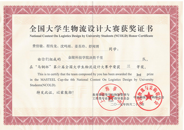 何宽博士和王翯华博士指导的“易周队”荣获本届大赛优胜奖,郑庆华博士和朱长宁教授荣获优秀指导奖,“决胜千里队”五位选手费佳敏、沈鸣雨、姜苏玲、程传龙、舒闻博均获得由中国物流与采购联合会颁发的物流从业人员职业能力中级证书。