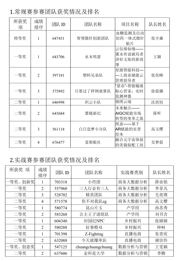 承办。本次大赛按照常规赛道、实战赛道分别进行评选,常规赛道最终评选出特等奖1项、一等奖3项、二等奖4项。实战赛道中:产学用赛道最终评选出一等奖1项、二等奖1项;乡村振兴赛道最终评选出一等奖1项、二等奖1项;商务大数据分析赛道最终评选出一等奖2项、二等奖2项;直播电商赛道最终评选出一等奖1项、二等奖1项;数据分析与营销赛道最终评选出一等奖1项、二等奖1项。
