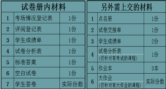 请单独上交给教务熊杜宁,无需填写试卷封面、无需打印试卷分析表、无需上交作业本。需要的材料有:考场情况登记表、标准答案、空白试卷、学生答卷、成绩单3份(按行政班打印)。