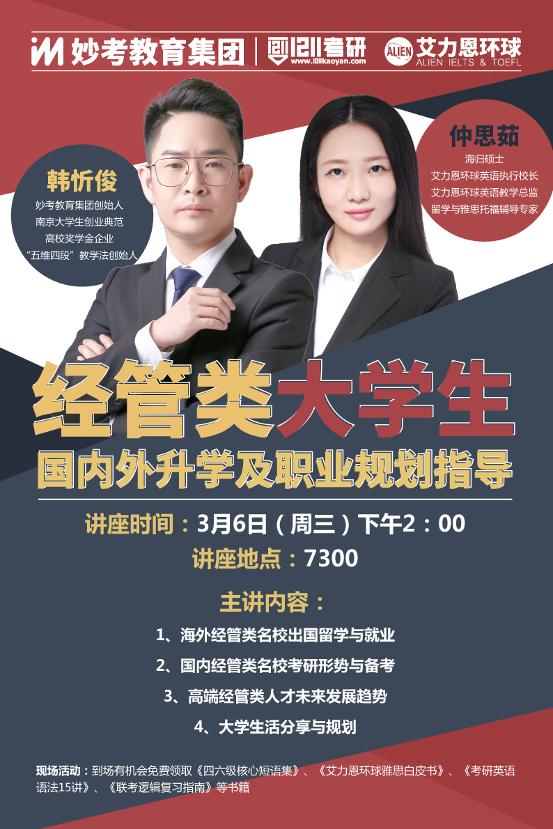 经管类专业的本科生以及有意向考经管类专业的研究生或出国留学深造的学生进一步明确大学生生涯规划,学校特邀请妙考教育集团举办“经管类大学生考研、出国及职业规划指导”讲座。