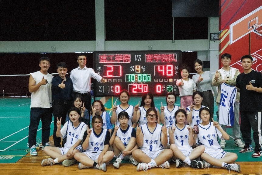 女子篮球队共有13名运动员,男子篮球队共有14名运动员。女篮冠军赛中,起初我院比分稍显落后,但运动员们不断调整自己的心态,在主教练员的带领下,一鼓作气,拼尽全力,随着一记记妙传,一趟趟过人,一次次拦截,一个个进球,吹响反攻的号角,不断与对手缩小比分差距。话筒里的“商院14号,三分球有效”无不牵动着每一位观众的心,现场爆发出雷鸣般的掌声,逐渐我院成功将比分反超,选手们士气高涨,运用团队配合不断进球,拉开差距,场下鼓声震天,局势悄然逆转,我院不断得分,最终以48:21获得本次“金科杯”篮球比赛女子组冠军!