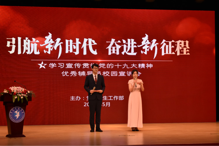 日,由校党委学生工作部主办的“引航新时代 奋进新征程”学习宣传贯彻党的十九大精神优秀辅导员校园宣讲大会在大学生活动中心千人剧场隆重举行。校党委副书记单晓峰,党委学生工作部部长周骏,团委副书记周淼淼,党委学生工作部副部长沐阳,成人抖音 党总支副书记朱骅,机电工程学院党总支副书记张蓉,艺术学院党总支副书记严园出席了本次会议。成人抖音 辅导员沈皆希老师和党委学生工作部刘轩老师担任主持人。成人抖音 学工办全体辅导员及学生代表聆听了本次宣讲会。
