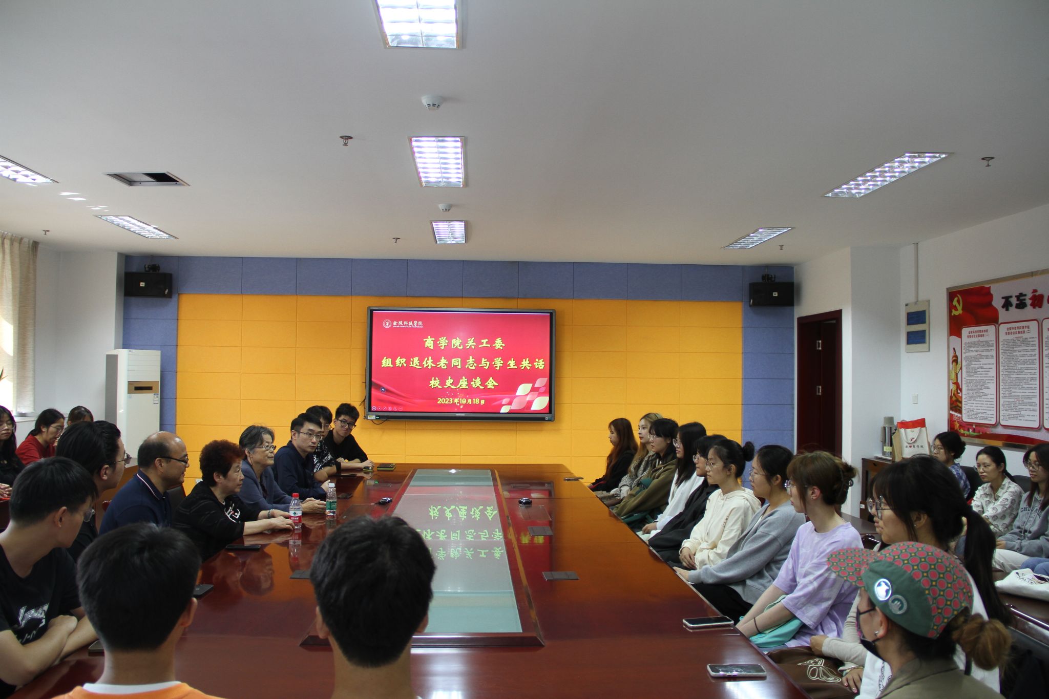 参观结束后,两位退休老同志和学生们在科技楼3号楼409会议开展退休老同志与学生共话校史座谈会。会前,由周骏书记带领大家一起学习习近平就做好关心下一代工作作出重要指示精神,然后由两位老同志分享了自己的教育教学经历和在校期间的奋斗故事。