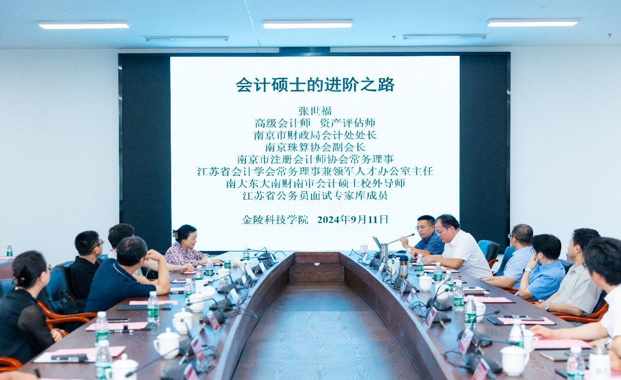 在科技楼3号楼110会议室举行产教融合对接交流会。南京市财政局会计处处长张世福、南京市注册会计师协会秘书长王益民、江苏省国资委派驻中江集团财务专员平焱、南京大地建设(集团)董事长伍贻安、立信会计师事务所江苏分所所长伍敏、江苏兴瑞会计师事务所所长许胜利、南京永宁会计师事务所所长杨晓琴、苏美达资本投资总监黄世文、江苏省环境科学研究院财务部主任柴小莺等领导、专家出席会议。成人抖音