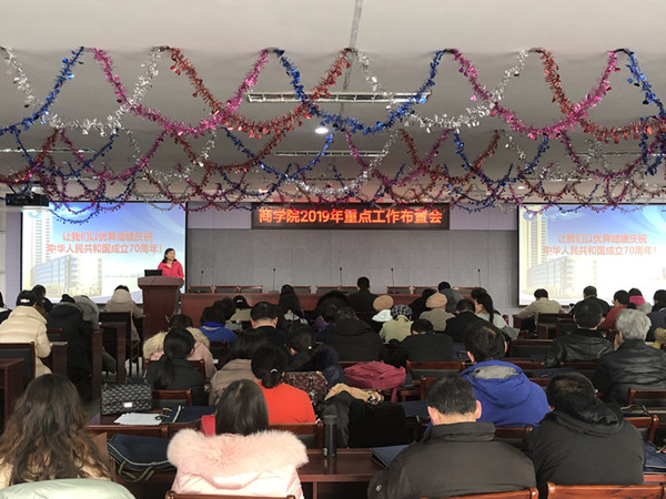 会上,院长顾晓燕首先传达了校党委书记陈小虎、校长聂影在校党委二届五次全会和2019年工作布置会上的讲话精神,然后从提高站位,抓好党的建设;认证评估,推进专业建设;立德树人,提高培养质量;创新作为,提升科研水平;对标对表,紧扣两升目标;凝心聚力,共创和谐家园六个方面对学院的重点工作进行了安排。随后,院党委副书记朱骅、副院长陶应虎、副院长刘磊分别就学生工作、教学工作和科研工作做了详细布置。院党委副书记(主持工作)陆国晓总结发言,并强调全体教职工要努力维护学院的安全稳定,重申了政治安全、学生安全等工作的重要性。