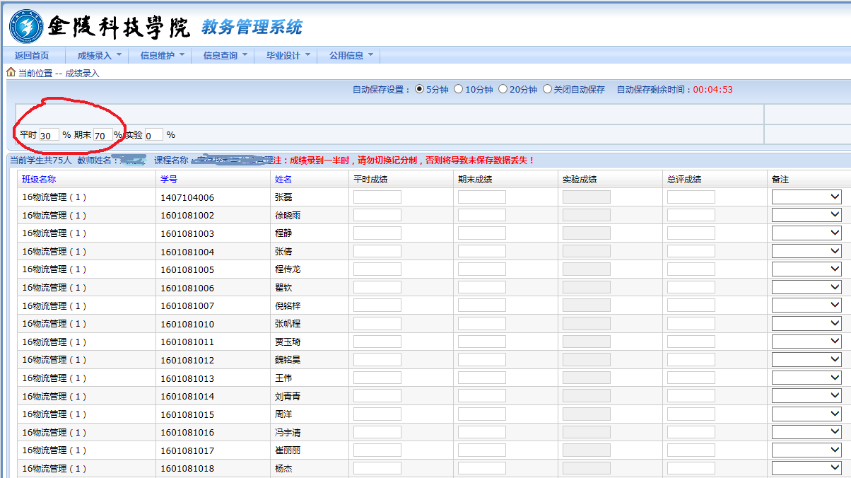 2.老师只需录入“平时成绩”和“期末成绩”,系统会自动按比例折算成总评成绩。平时成绩、期末成绩一律采用百分制计分(毕业实习、毕业论文除外)。
