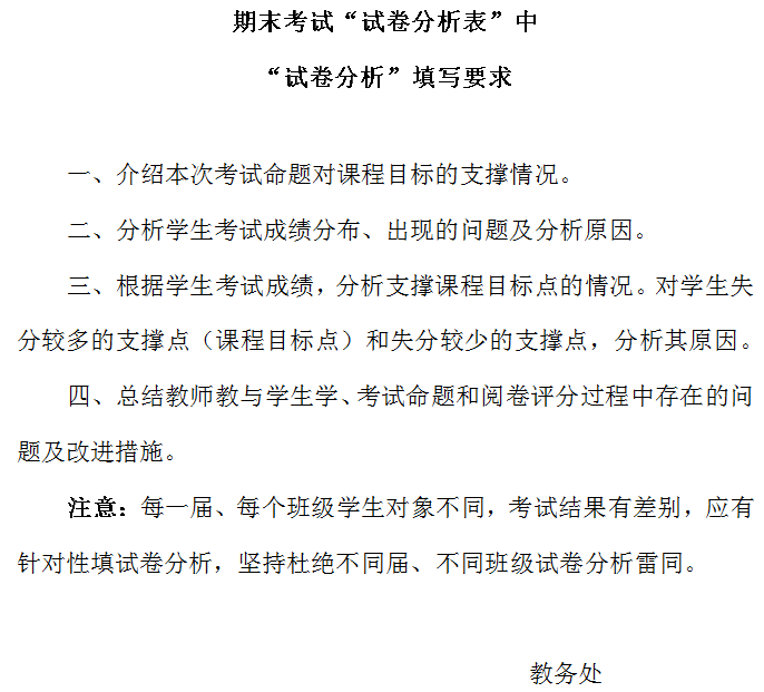 教师须在“试卷分析”一栏中需详加分析,具体要求请见下图教务处通知。
