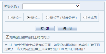 4.试卷分析表(A4纸),从教务管理系统中选择 “格式三” 打印,一式两份(在上方空白处注明班级后,1份装入试卷册,1份另交教务存档)。