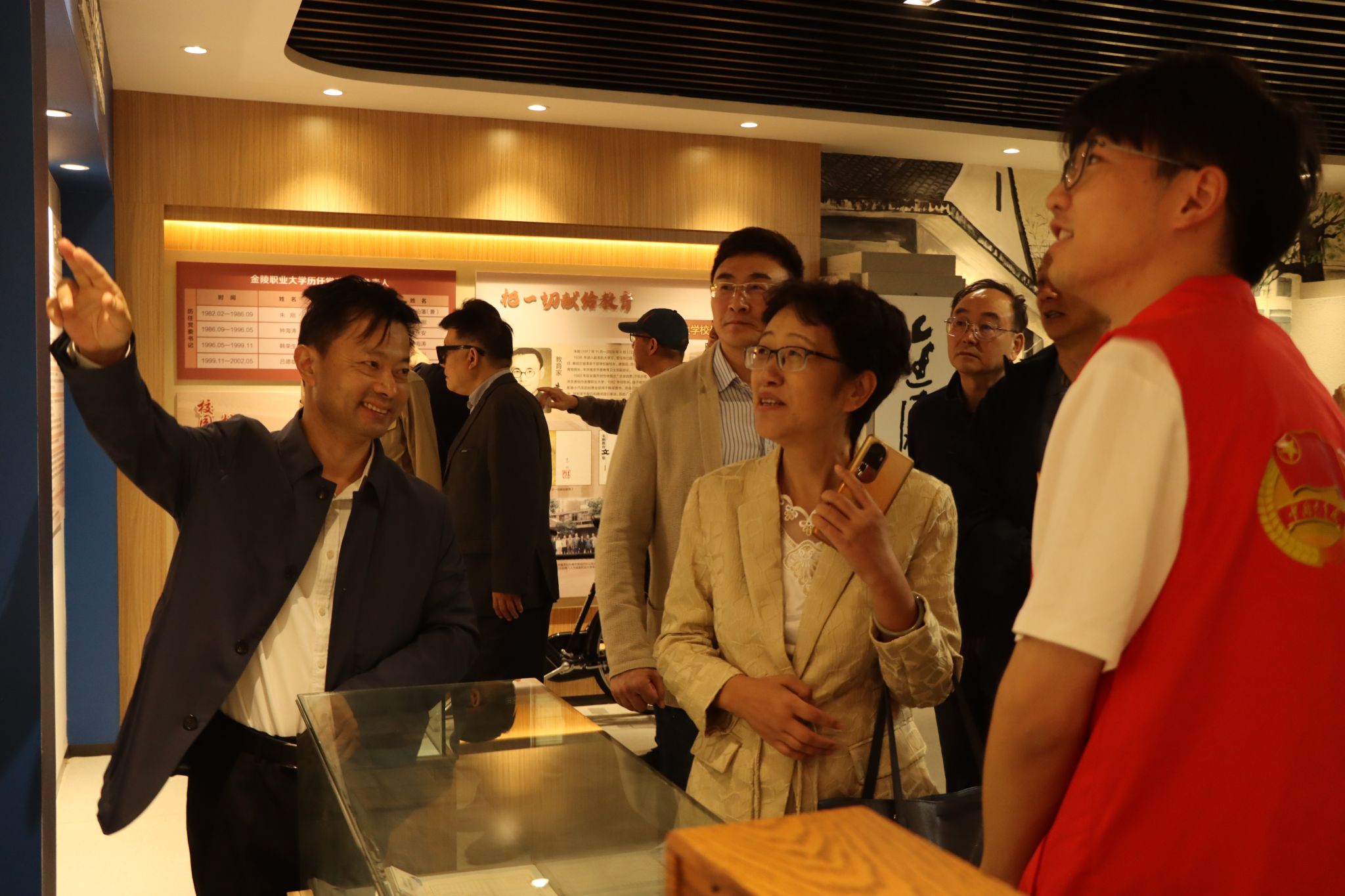 当天上午校友一行先行参观原金陵职大校区地址(现学校白下科技园),校友们重返母校追寻记忆足迹。他们携手同行,抵达熟悉的校园,笑谈往昔岁月。随后转至江宁校区1号科技楼25层校史馆,在校友工作办公室安排的学生讲解员的陪同讲解下开展参观活动。校史馆内陈列的一张张珍贵图片,一份份历史史料,勾起了校友们对青春岁月的深刻回忆。参观过程中,校友们重温了学校的发展历程,感慨母校多年来的巨大变化。