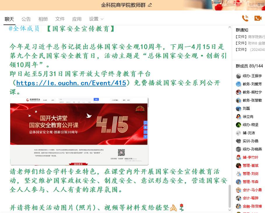 4月15日(周一)晚上七点,组织大一至大三各班生活委员,在北区1511教室,集中观看中国大学生在线官网(//dxs.moe.gov.cn)及中国大学生在线视频号、微博、B站、抖音等直播平台发布的国家安全系列公开课,其余同学自行组织观看国家开放大学终身教育平台(//le.ouchn.cn/Event/415)免费播放的国家安全系列公开课。