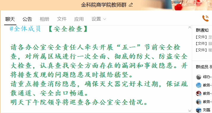 “五一”假期前,院领导对所有办公室、实验室进行安全巡查,及时发现个别办公室电源线、充电线没有断电的情况,对相关老师进行安全提醒,消除安全隐患。