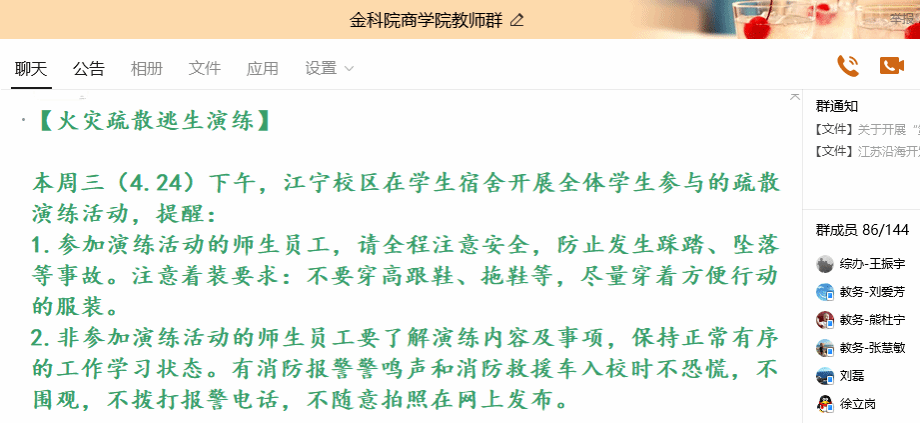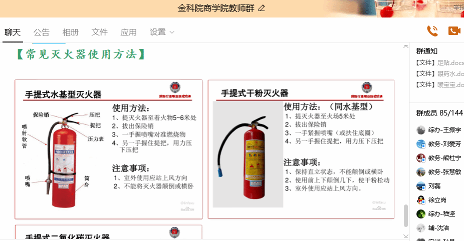 除组织观看直播公开课外,学院还借助QQ群、微信群等各类平台,宣传消防安全知识,强化师生的消防安全意识、提升消防自救能力。