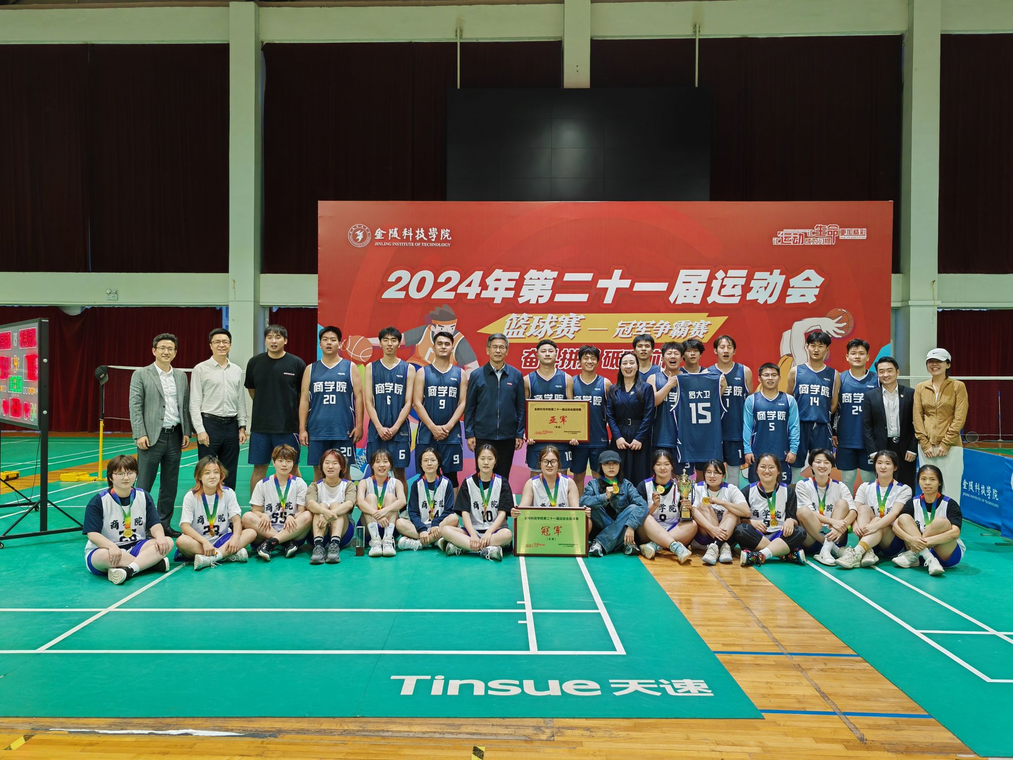 4月17日,由金陵科技学院体育运动委员会主办的第二十一届运动会篮球赛——冠军争霸赛在江宁校区体育馆圆满结束。历经多轮激烈比拼,成人抖音 女子篮球队、男子篮球队均进入冠军争霸赛。我院参赛队在决赛中发挥出色,女子篮球队蝉联冠军,男子篮球队获得亚军,成功刷新成人抖音 篮球比赛最好成绩。院党委书记徐立岗、院长刘磊、院党委副书记孙亮以及各年级学生代表来到现场观看比赛,为成人抖音 篮球队加油助威。赛后,校党委书记刘志远、副校长顾晓燕亲自为每一位参赛队员颁奖留念。