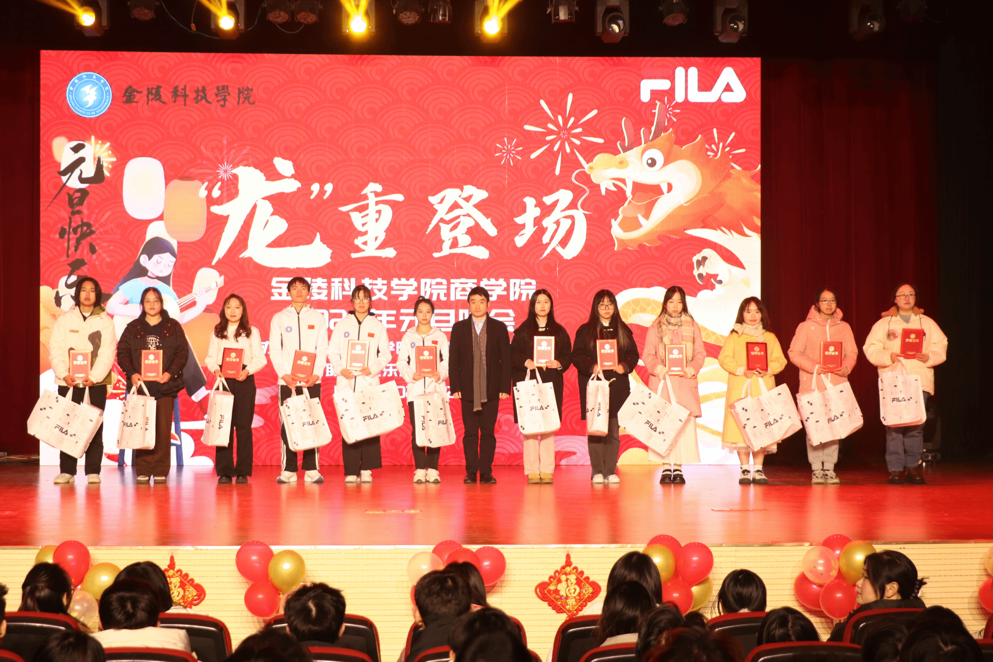 晚会伊始,为展示我院学生在科研、文艺、体育、志愿服务等各个方面取得的优异成绩,评选出了12名先进个人代表,并由孙亮副书记为各位标兵颁奖。随后班助和23级新生带来表演《第一天》拉开了整场晚会的序幕,本次元旦晚会节目精彩纷呈,有歌曲、舞蹈、话剧、小品、幕布剧和民乐合奏等多种表演形式,充分展示了成人抖音