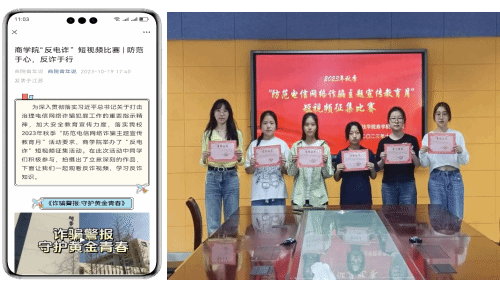 举办了“反电诈”短视频征集活动,本次比赛共评选出一等奖1名,二等奖2名,三等奖3名。其中一等奖作品《诈骗警报:守护黄金青春》得到师生的一致好评,获奖作品在商院青年说微信公众号进行宣传推广。