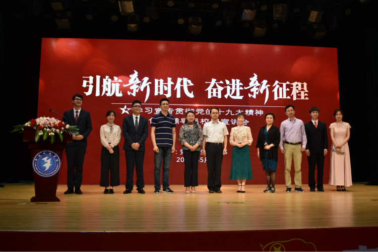 老师。在一个多小时的演讲时间里,五位老师结合自身多年的学生工作经验,逐一向现场近千名师生分享了自己对党的十九大精神学习感悟。他们虽然来自不同的学院,但都全身心投入到思想政治教育工作,鼓励学生执笔青春、放飞梦想。一段段朴实无华的纪录视频,展现了他们“桃李不言,下自成蹊”的教学精神;一番番情真意切的深刻演讲,感染了在场的每一位观众。会议结束之际,现场掌声雷动,与会领导和老师上台合影留念。