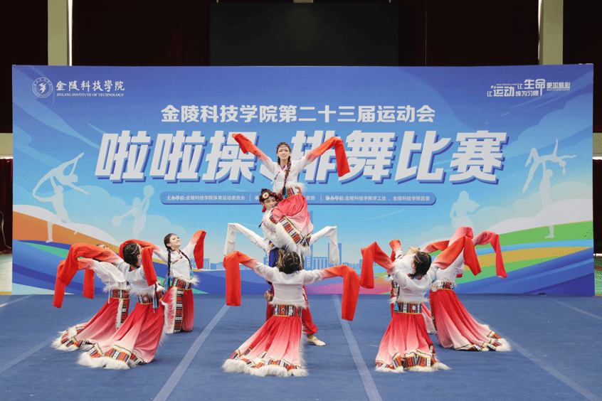 共派出16名啦啦操队员和10名排舞队员,他们身着统一服装,精神抖擞登场。伴随着激昂的音乐,啦啦操队员们动作整齐划一、舒展有力,跳跃、旋转、托举等技巧动作衔接流畅,既展现了啦啦操运动的活力与舞蹈动作的美感,又彰显了团队协作的凝聚力。随后,伴随着悠扬而渐强的藏族弦乐与鼓点,排舞队员们以“甩袖”动作起步,他们的长袖如云浪翻涌,身体随音乐起伏,仿佛风吹过高原草甸。在音乐高潮处,队形快速变换,穿插、聚合、散开,如哈达在空中交织飞舞。
